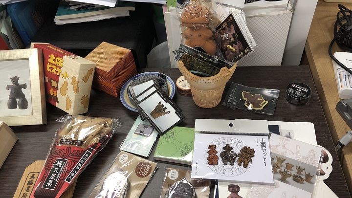 さらに衝撃を受けたのが、レプリカ以外のグッズーコーナーの展示スペースだった。そこには「土偶ビスケット」「土偶ワッペン」「土偶さん携帯ルーペ」等々、これまで私の見た事の無いグッズがズラッと並んでいるではないか。