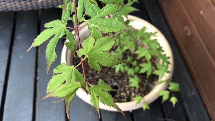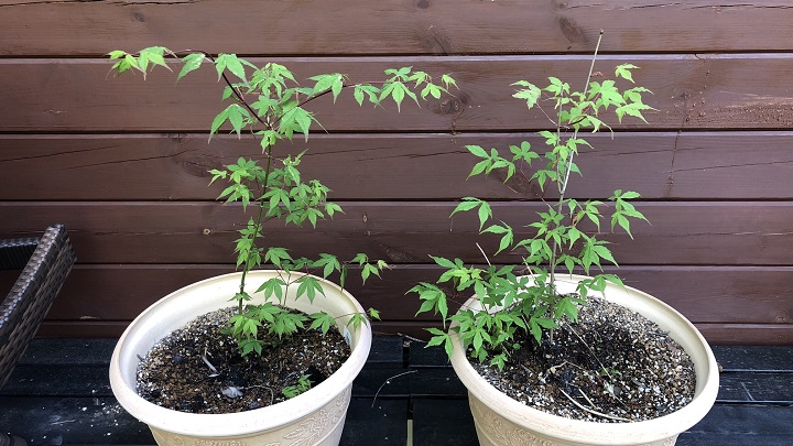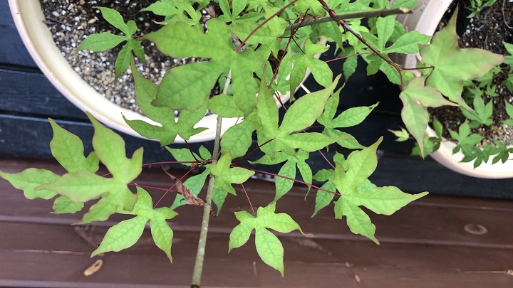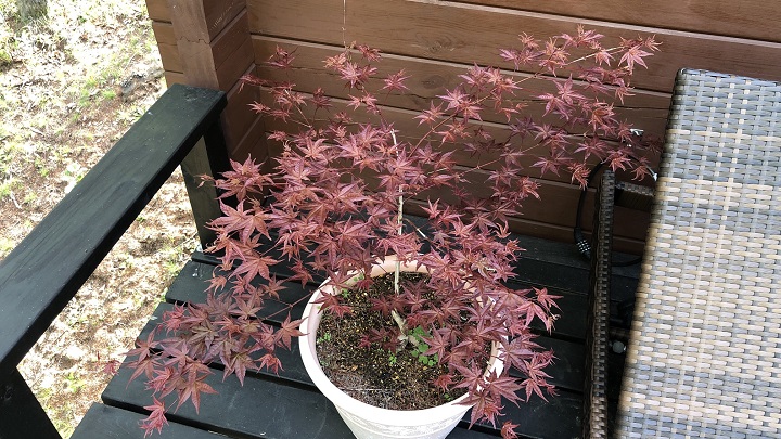 ところが、5月4日の「タケニグサ殲滅戦(https://www.triglav.life/?p=21861)」の際に、財産区林との境界付近に「奇跡的」に自生する2本の楓を発見。DEER軍団に発見・攻撃される前に守り抜こうと、直ちに鉢に移植。オフィスウッドデッキに置いて保護した。