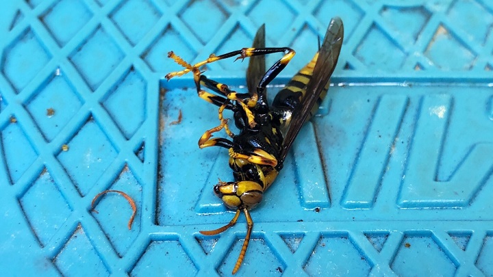 まずは、バルブ栓の上に落ちた1匹目。改めて見ると「黒と黄色」のコントラストが美しい戦闘機をイメージさせるシェイプだ。