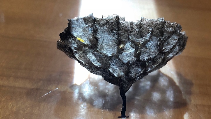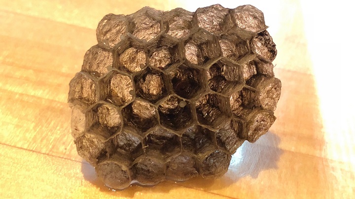 第2波攻撃の対象とした女王蜂は飛び去ってしまったので、脚立に上って、一番大きく形も整っていた「巣」をもぎ取って、オフィスのデスクの上で太陽光の下、写真撮影。
