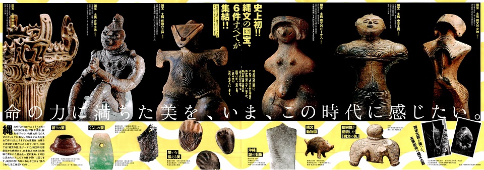パンフレットを開くと、国宝土偶さん5体と国宝火焔土器1点がズラッと並んだ豪華な写真が見開きで掲載されていた。中央右側に「縄文のビーナスさま」、左側に「仮面の女神さま」という「尖石国宝土偶ツートップ」が並んでいるのは、まるで我が事のように誇らしい。