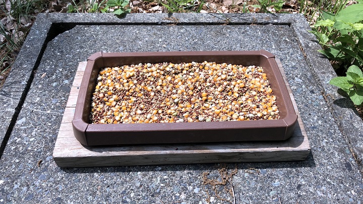 100円ショップで購入したプランター用の水受けに皿にビスを4本打って端材に固定。水抜き穴をドリルで7カ所開けただけである。