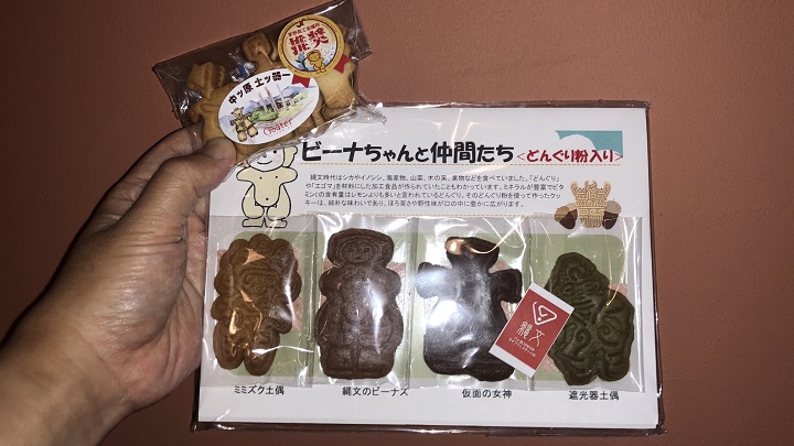 この日の予定をすべて終えた後、購入したクッキーを改めて並べてみた。土偶さん4体入りのクッキー「ビーナちゃんと仲間達」、小型の土偶さんや土器が8体(個)入った「中ッ原土ッ器ー」、そして「縄文のヴィーナス」との名が付された焼き菓子が、それぞれ1袋である。