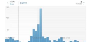 30分毎にデータが記録されるのだが、降雨量の1時間当たりのピークは、昨日(6日)の午前0時~1時で16.7mmの雨が降っていた。最も雨が強かった時間帯は、5日の午後9時から6日午前3時だったが、この6時間でも累積降雨量は43.3mm。この程度の雨なら被害は無いだろう。ホッと一安心。