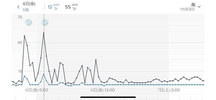 続いて、風速計のデータをチェック。こちらは、オフィスウッドデッキの手摺りに取り付けてあるので、正にオフィスに吹き付ける風の強さを記録してくれる。グラフを見て「絶句」。5日の午後9時45分に52km/h、6日の午前1時15分に55km/hという見た事もない最大瞬間風速を記録しているではないか。