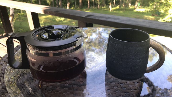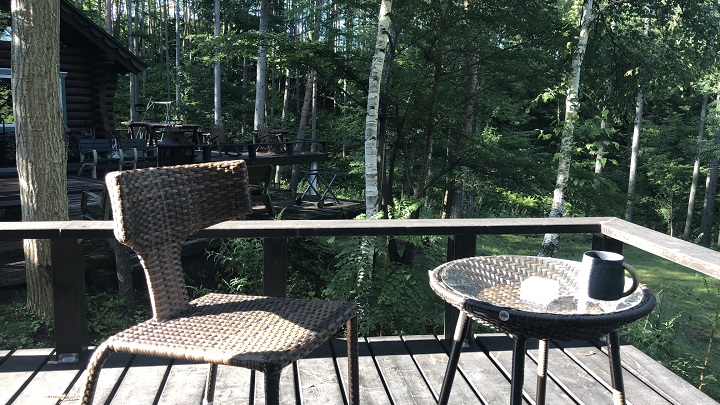 ピュアアメリカンの豆を選んで、NC-A56で珈琲を淹れて、初使用となる有田焼マグカップに注ぐ。珈琲を味わう場所は、勿論、八ヶ岳の朝陽が降り注ぎ始めたオフィスのウッドデッキである。