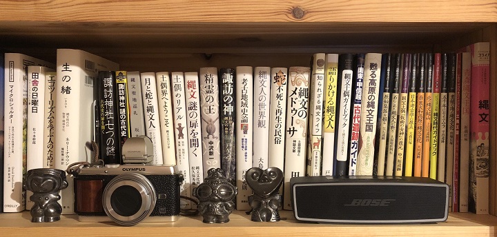図録の箱の中には、送料無料とするために一緒に注文した「土偶さん達のレプリカ」も入っていた。実際にはレプリカと言うよりも、南部鉄製(南部鉄偶)で薬罐や鍋に入れて「鉄分補給」する用途の土偶さん達なのだが、私にはそんな恐れ多い事は出来ない。早速、2段ある「縄文関連書籍」の上の段に並べてみた。「うふっ。これは宝物だな。」と大満足。