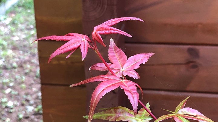 オフィス・ウッドデッキデッキでリハビリ中の4本の楓さん達は元気に枝を伸ばし、ショウジョウカエデの葉は一部が既に赤く色付き始めているではないか。