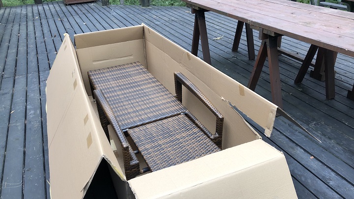 結局、開梱作業に着手したのは、仕事が一段落した午後5時過ぎ。カッターで丁寧に分厚い段ボール箱をバラして行ったら、人工ラタン材のベッドがなんと「完成品」状態で入っていた。箱が巨大である理由が漸く判明。組立作業が不要なガーデンファニチャが届くなんて初の体験である。