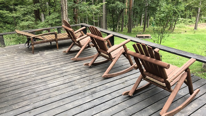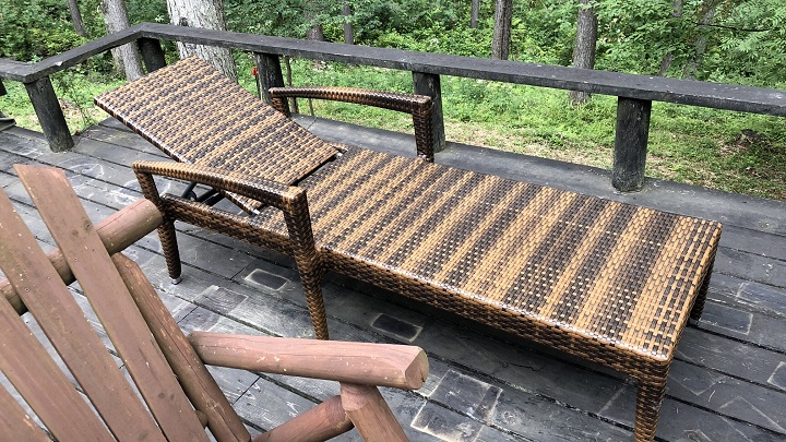 早速、メインウッドデッキの財産区林寄りの一画に置いて寝転がってみた。直線的でガッチリした作りだが、人工ラタン特有の適度な弾力感があり、1台目と同様、とても快適である。