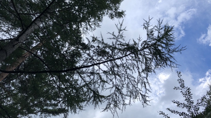 空を見上げたら、メインウッドデッキの上にカラマツの枝が覆い被さっているのに気が付いた。「この枝は邪魔だな。明日、伐採する事にしよう!」