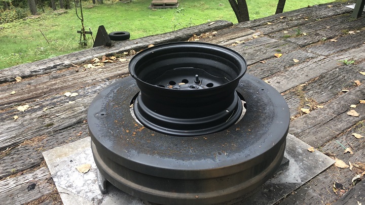 ネットで焚き火台を片っ端から探していたら「スチールホイールが焚き火台に使えるぞ」みたいな類の書き込みが数件あった。すぐにピーンときて、いつもお世話になっている富士見のタイヤガーデン ピットインの店長さんに電話。「大きめのスチールホイールで廃棄するものがあったら頂戴ね!」とお願い。これが前々回の滞在時の事である。前回滞在時に電話したら、ちゃんと依頼を覚えていてくれて、15inchのスチールホイールを2個ゲット(勿論、無料である)。長野というか、諏訪界隈の人達は、こういう約束事をしっかりと覚えていてくれて本当に律儀に対応してくれる。時間にも几帳面な方が多くて、私のような人種には本当に居心地が良い。
