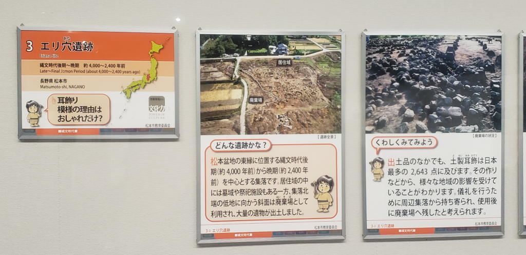 「白神山地東麓」の方は青森県と想像がついたが(実際にそうだった)、「エリ穴遺跡」の方は所在地の見当がつかなかった。解説プレートを読むと「長野県松本市」。結局、東北と八ヶ岳(長野・山梨)という2大縄文王国から新たに出土した(ニューフェイス)土偶さん達との出会いの場となった。四脚付土偶さんやこれまで見た事も無い巨大な土偶さんの脚部(もし全身が揃ったら超巨大土偶さんである)等々、レア物さんをじっくりと堪能。あ~、大満足!