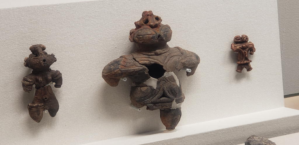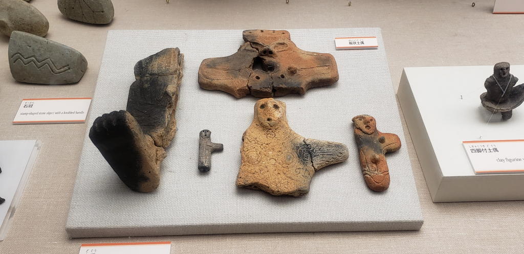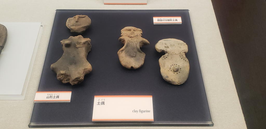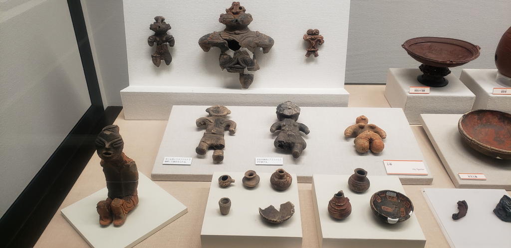 そんなわけで大急ぎで見学開始。すぐに土偶さん達の展示コーナーを発見したのだが、土偶さん達がレプリカなのか実物なのか表示がない。また、時間が無かったので写真撮影についても未確認。どうしよう… 幸い女性の学芸員さんが展示室内を巡回していたので、すぐに質問。すると ①すべての土偶さんが最近発掘された遺跡から出土したもので「実物」 ②写真撮影もフラッシュを使わなければOK という「万歳」を叫びたくなるような答えが返ってきた。