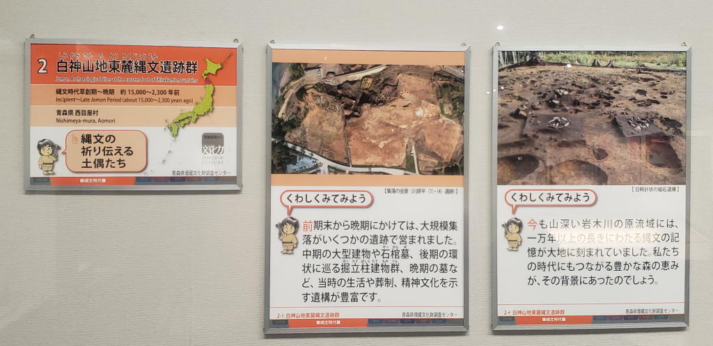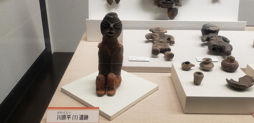 時間に余裕が無いので、土偶さんと縄文遺跡の展示コーナーを中心に鑑賞。「白神山地東麓縄文遺跡群」に「エリ穴遺跡」と聞いた事のない遺跡が紹介されており、これまで見た事も無い土偶さん達が並んで展示されていた。厳密に表現すると「実物だけでなく、写真集でも見た事の無い」土偶さん達である。