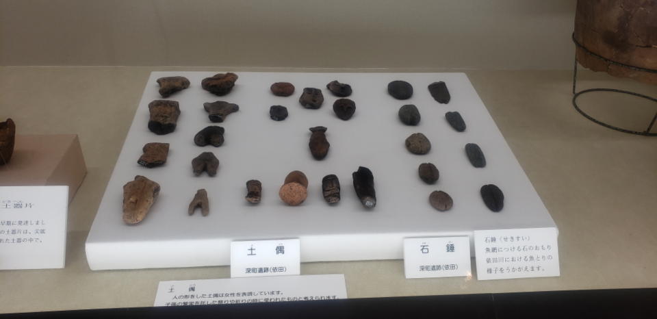 受付で入館料1人100円(社主さまもご同行)を支払って探訪開始。お目当ての考古関係の展示室は1F「第1展示室」である事を確認し、受付正面の部屋に直行。事前に予想はしていたが、それ以上にこぢんまりとした展示スペースである。博物館のアーカイブで紹介されていた淵の上遺跡出土の土偶さん型容器はすぐに見つかったが、残念ながらどれもレプリカ。探訪後に博物館のアーカイブを改めて確認したら、ちゃんと「複製品」と表記されていたので、私の事前リサーチ不足だった。