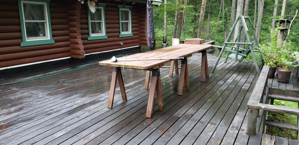 塗装作業の最大の敵は「雨」、第二の敵が「庭木の花びらや葉」である。冬は寒くて作業できないし、春は桜を筆頭に花びらが舞い散り、秋には広葉樹の落葉と唐松の葉の黄金のシャワーがあるので、塗装作業には適さない。そのため「梅雨明け直後の初夏」が必然的に、塗装作業の最適期となる。また、塗装作業においては、私よりも「社主さま(家内)」の方が、熟練度も効率も勝っている。社主さまのご都合がよく、梅雨明け直後という事で、ウッドデッキの塗装作業日と決まったのが、この土日(3日~4日)なのだ。