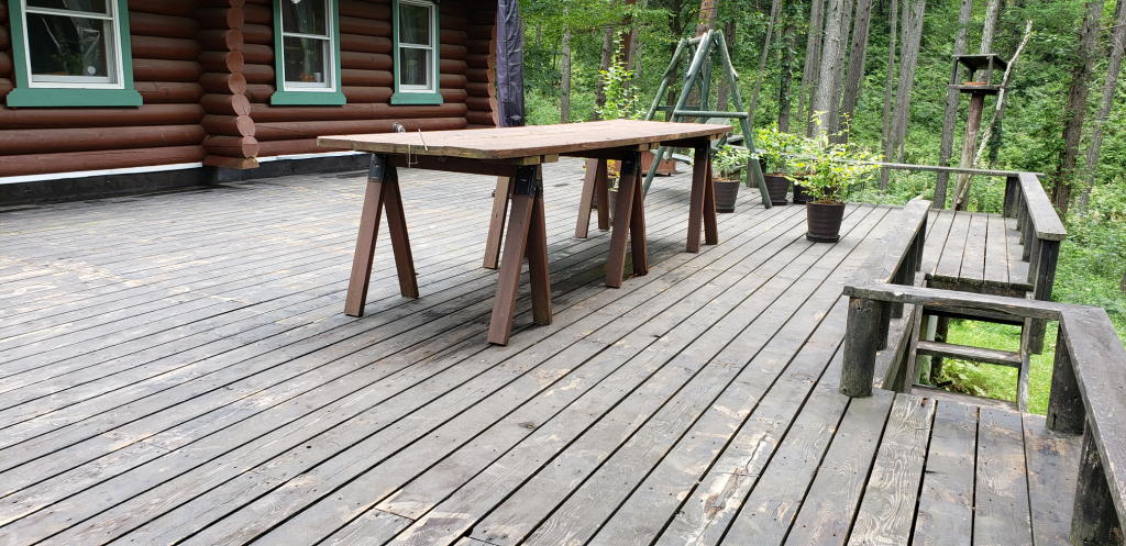 2つのログハウスの外壁塗装作業は勿論、定期的に行っている。実は、外壁以外にもうひとつ大切な塗装作業がある。ログハウスを取り巻くように広がる「ウッドデッキ」である。本宅のメインウッドデッキが116㎡、オフィスのお庭展望ウッドデッキが21㎡、合わせると137㎡(約75畳)。もちろんすべてがセルフビルドだ。これだけ広いと塗装作業にもかなりの時間とコストを要する。外壁の塗装とは別の年に実施するのが、我が家の仕来りであり、そして、今年が正にその年なのである。