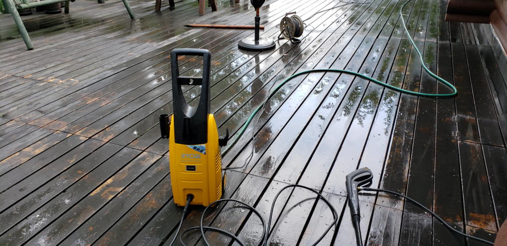 高圧洗浄機に電源コード、水道ホースををオフィスウッドデッキ移して、午後2時頃から洗浄作業開始。面積はメインウッドデッキの6分の1程なので2時半前には作業完了。