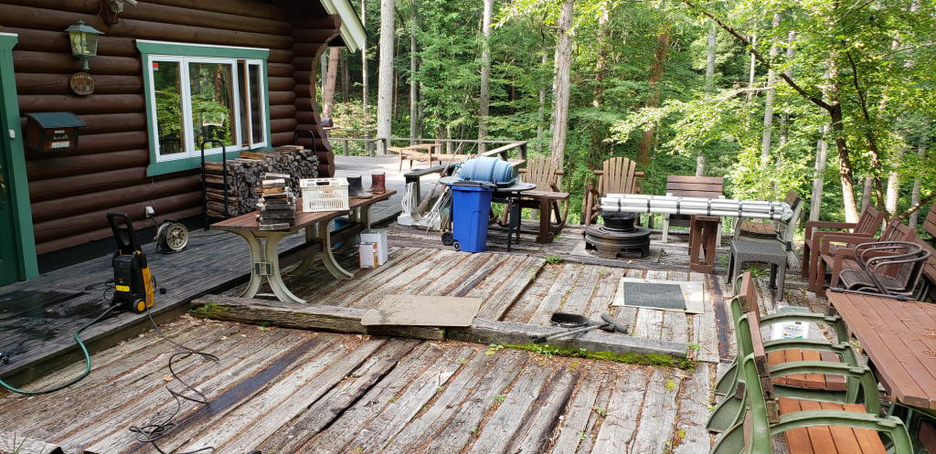 第2段階が、高圧洗浄機によるウッドデッキのお掃除。デッキ面の洗浄以上に重要なのが、床板と根太の隙間に詰まった唐松の葉を吹き飛ばす作業だ。同時に、デッキ材の傷んだ部分を特定し、後日の補修作業へとつなげる。