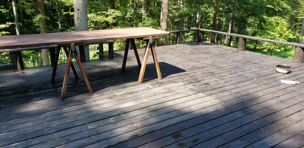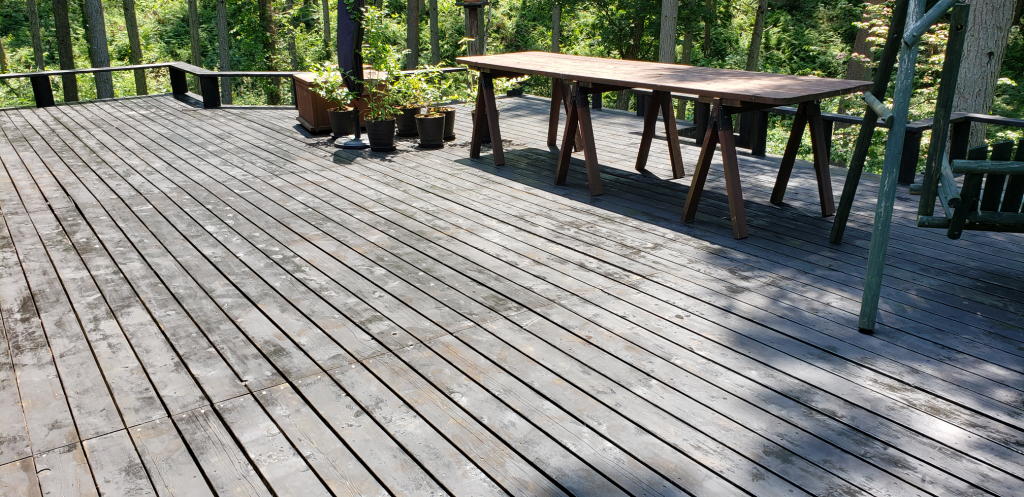 ウッドデッキ塗装作業2日目。新百合ヶ丘の自宅で所用がある社主さまは、明日(5日)の早朝に高速バスで自宅に帰る予定だ。そんなわけで、どんな事があっても2つのウッドデッキの塗装作業を今日中に終わらせねばならない。