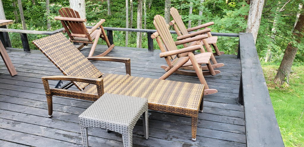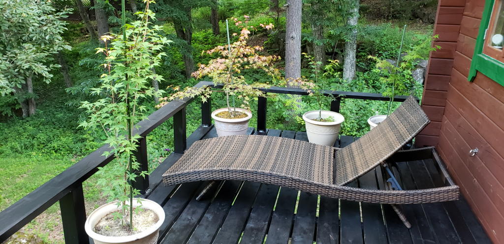 さて今日は、どっちのウッドデッキで珈琲を楽しもうか? 塗装を終えたばかりの2つのウッドデッキを眺める。桃を食べるにはオフィスウッドデッキのテーブルの方がいいな。決定!