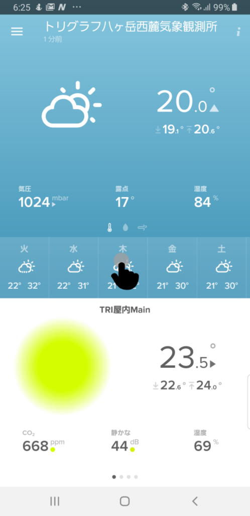Galaxy Noteでトリグラフ八ヶ岳西麓気象観測所のデータをチェック。6時25分の外気温は20.0℃、オフィスの室内気温は23.5℃。今日も快適だ!