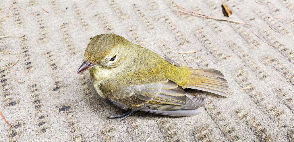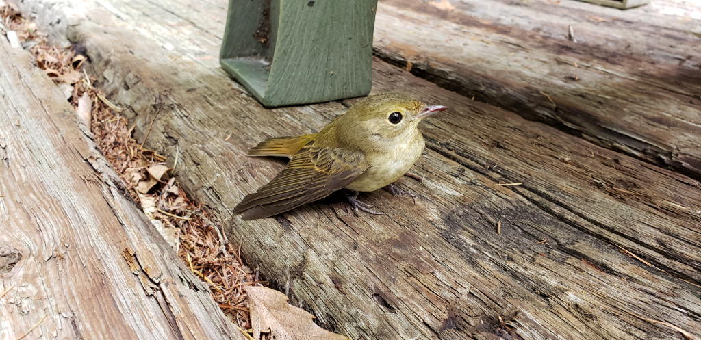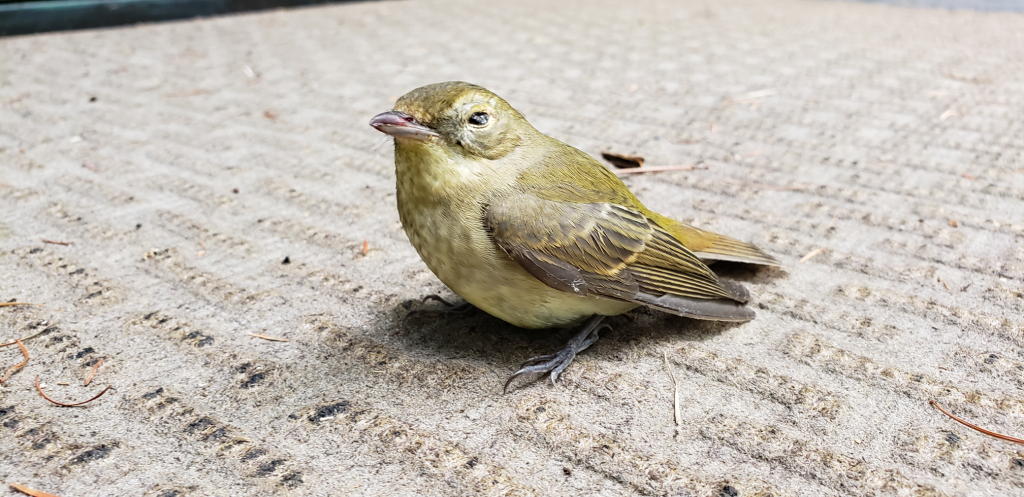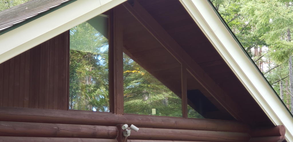 外傷は特にないが、動きが鈍く、ちょっと頭を動かす程度である。すぐにピーンと来た。八ヶ岳本宅の大きな三角窓に激突して脳しんとう起こしているんじゃないかな… 本宅の窓に周辺の樹木が映り込んで、林と勘違いした野鳥が時々突っ込んでくるのだ。