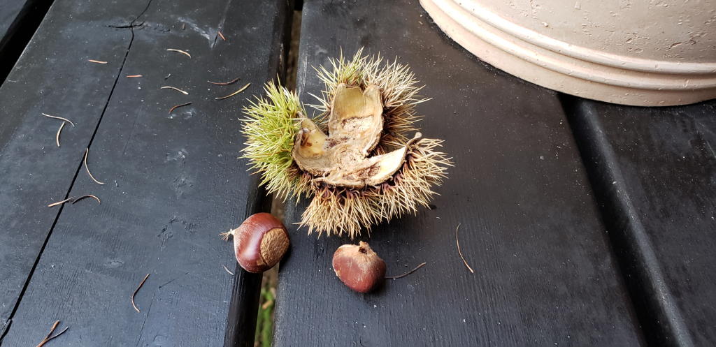 山栗はウッドデッキや枕木テラスの上に例年以上に沢山落ちているな…