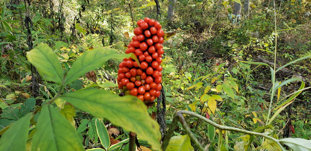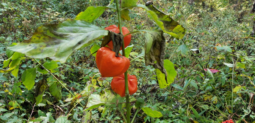 マムシグサほどには目立たないが、赤い袋状の実をならした植物も数株発見。「ホオズキ」だ。こちらは「生薬(鎮痛剤)」として知られてはいるが、アルカロイドを含んでいるので「毒性」もある。かつては堕胎薬として用いられた時代もあった。「薬と毒は表裏一体」なのだ。