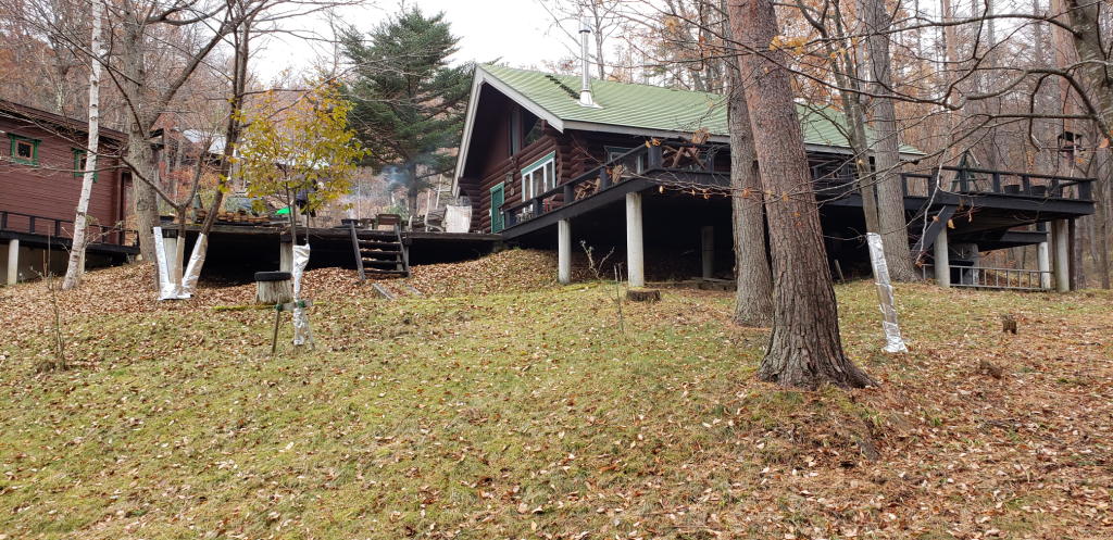 残った「枯れ葉のブロワ吹き作業」は、今年は暖かいためか、まだ落葉が終わってない木々が多いため、次回滞在時への先送り決定。私がウラジロモミ等の枝の伐採を始めたところで、雨がひどくなり、庭での作業を中断した。