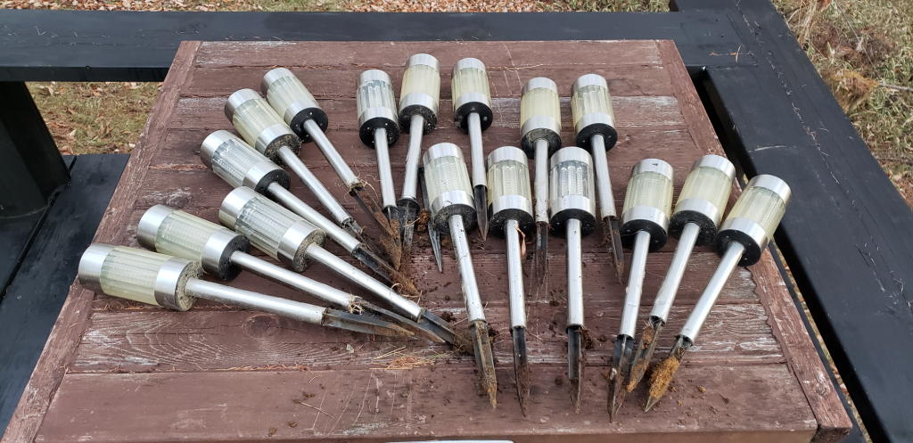だが、今日の午後4時前、枕木テラスで焚き火を楽しんでいた時に、まだ終えてない作業が残っている事に気が付いた。いけない、ガーデンソーラーライトを撤収していなかった。大慌てで作業を開始。幸い、まだ地面が凍っておらず簡単にライトのアンカー部分を引き抜く事が出来た。ガーデン小物類の収納箱に入れて、今度こそ「冬の準備」が完全に終了(^_^)v