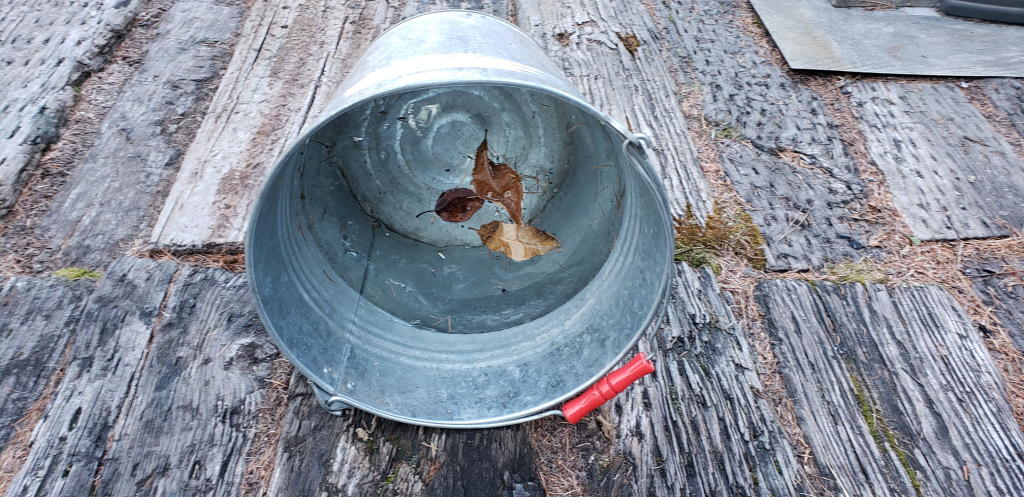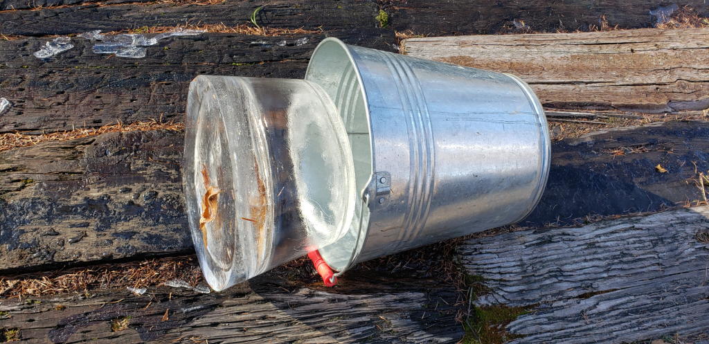 一旦オフィスに入り、5分程して枕木テラスに戻ると、先程横倒しにしたバケツから氷が外れていた。すごい氷の厚さだな…