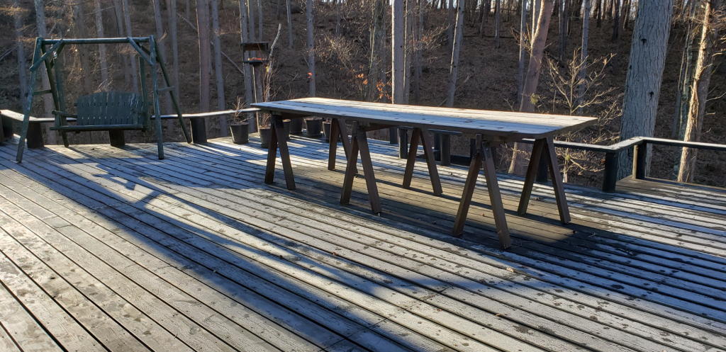 メインウッドデッキで深呼吸。デッキも作業台も霜が降りて、白くコーティングされたかのようだ。野鳥達が餌に困る時期に入ったな。今日から給餌開始だ!