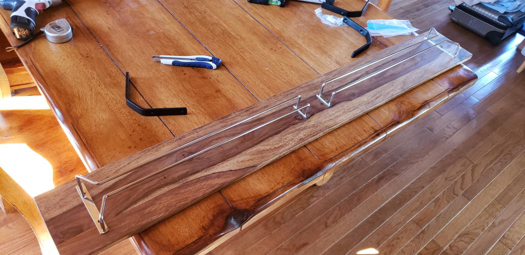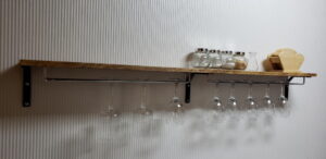 「既製品」を購入すれば取り付け簡単で、かつ安いのだが、いざ探してみるとお洒落なモノがない。結局、グラスホルダー部分、棚板、棚板金具と個別に気に入った物を買い集めた。