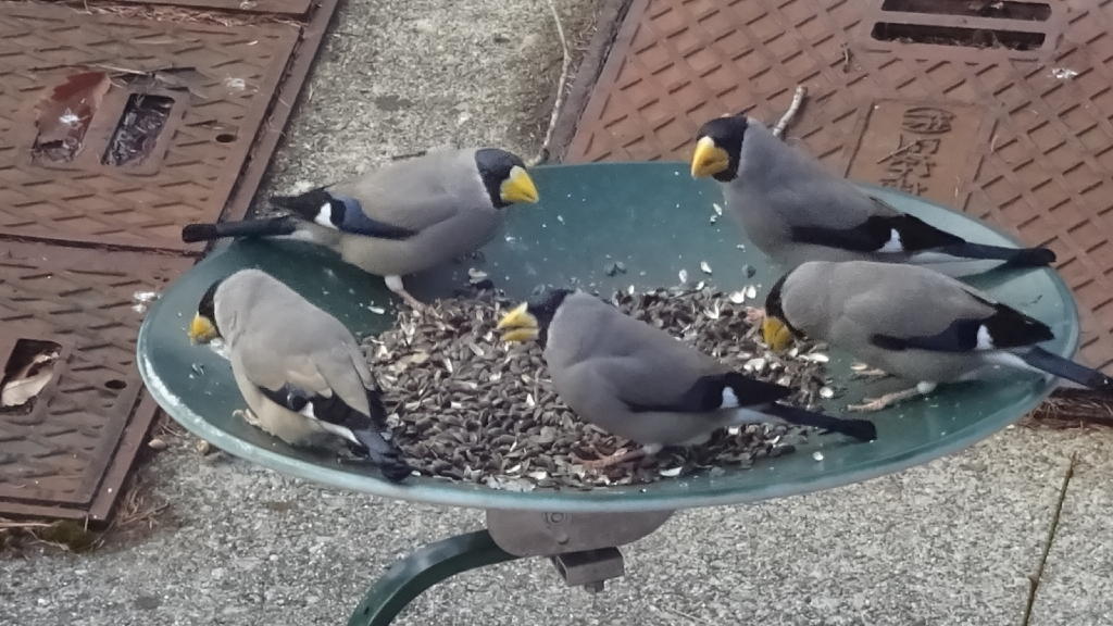 そして、午後2時過ぎ。ついに「イカル軍団」が3号店にやって来た。だが、これまでのように何羽も群がってヒマワリの種を奪い合うような事はなく、1羽ずつお行儀良く種を啄んでいる。