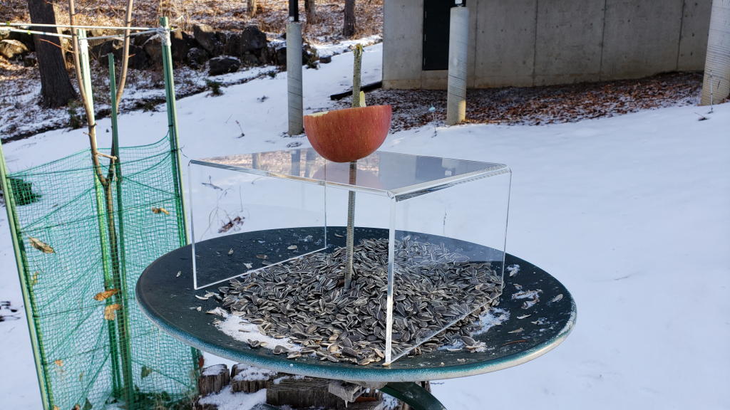 山盛りの種と大きなリンゴを突き刺して八ヶ岳オフィスを後にしたのは12月30日早朝。だが、1月4日に初出社して異変に気が付いた。1号店と2号店は、リンゴもヒマワリの種も跡形もない状態だったのだが、3号店は30日に置いたヒマワリの種が半分以上も残っていたのだ。