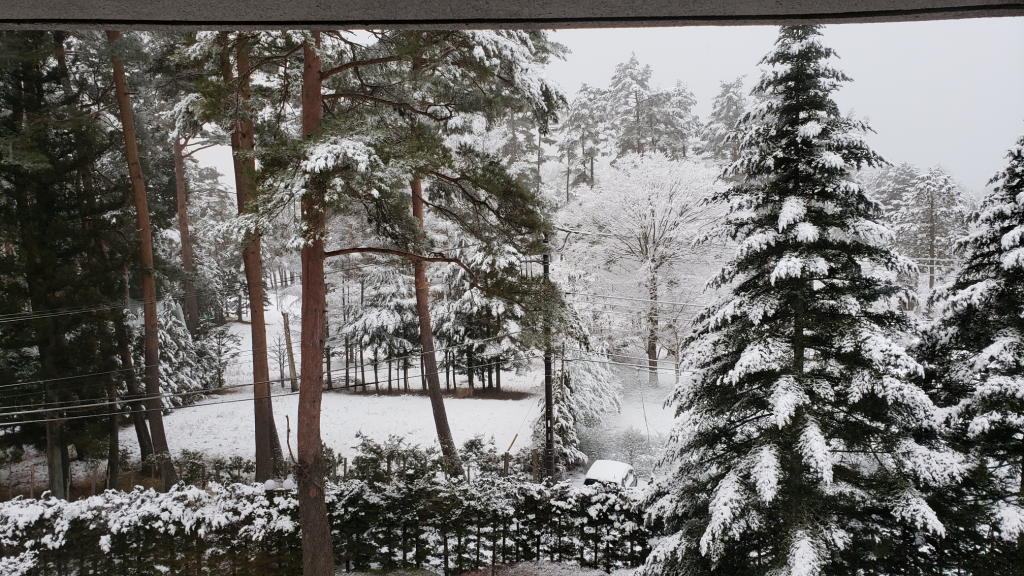 今朝、河口湖のリゾート施設で目覚めて窓から外を眺めてビックリ。一面が雪景色だった。