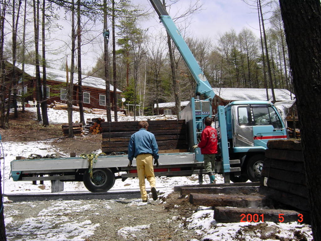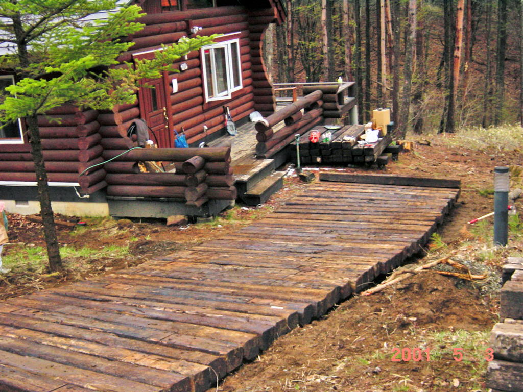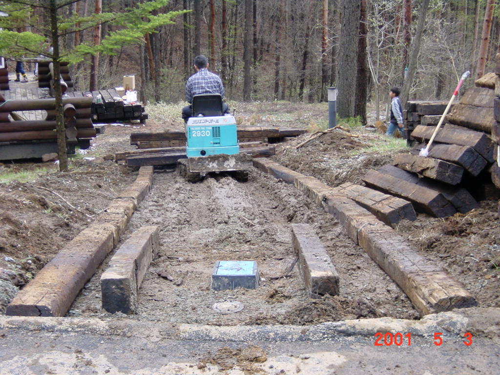 その直後から、枕木の大量調達に私自らが動き、八ヶ岳ライフ2年目のGWまでに計350本の枕木を購入。知人Tさんの助けを借り、GW休暇中に「枕木のスロープ」を一気に作り上げた。