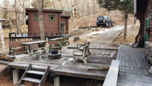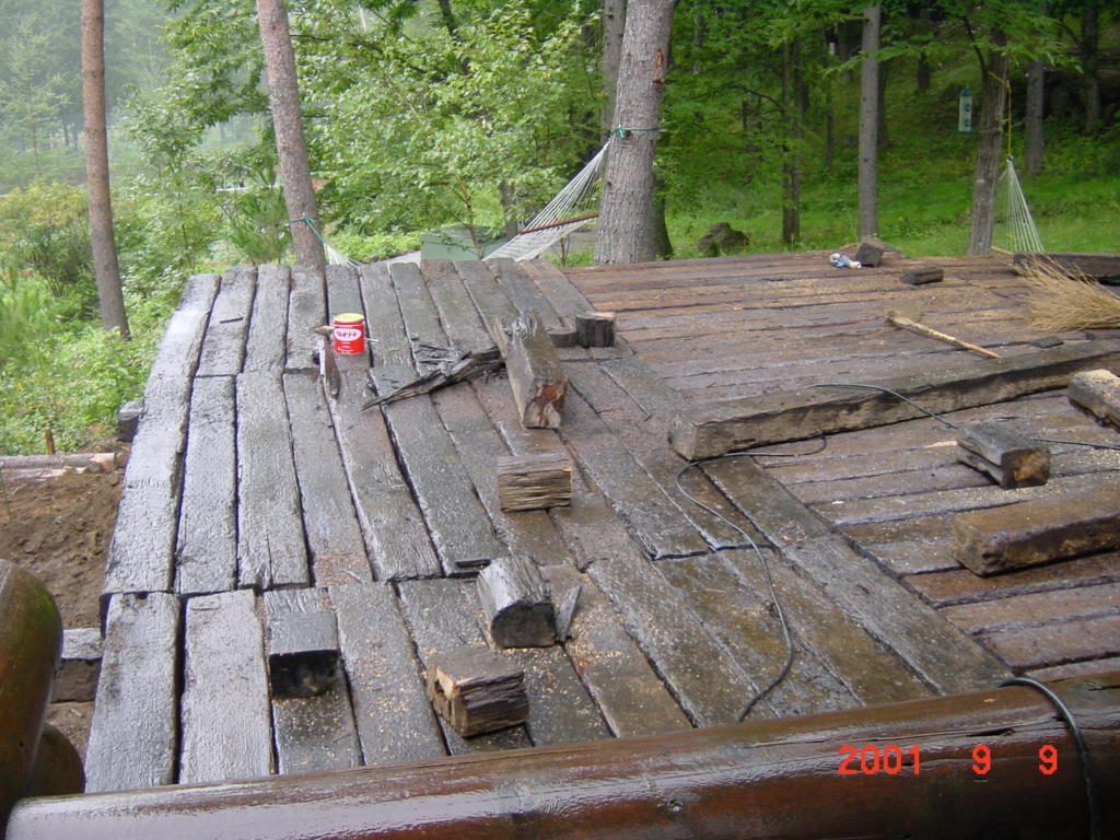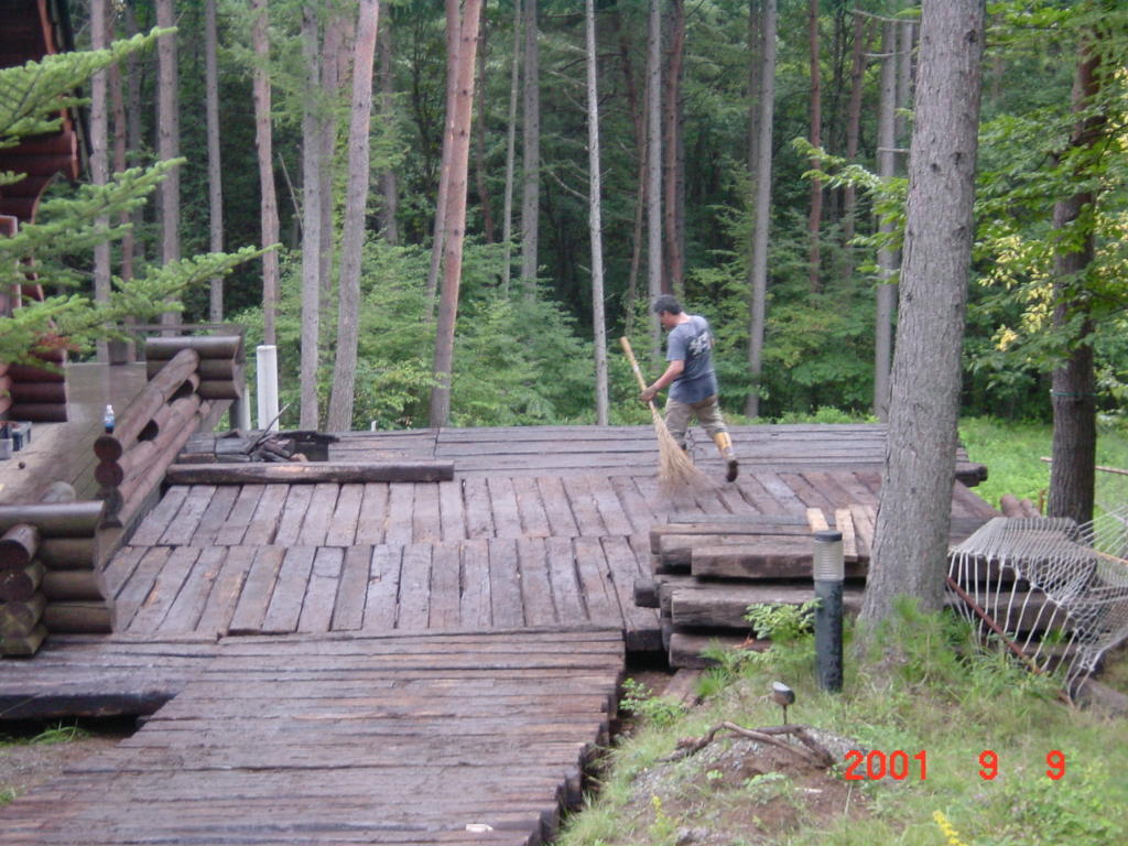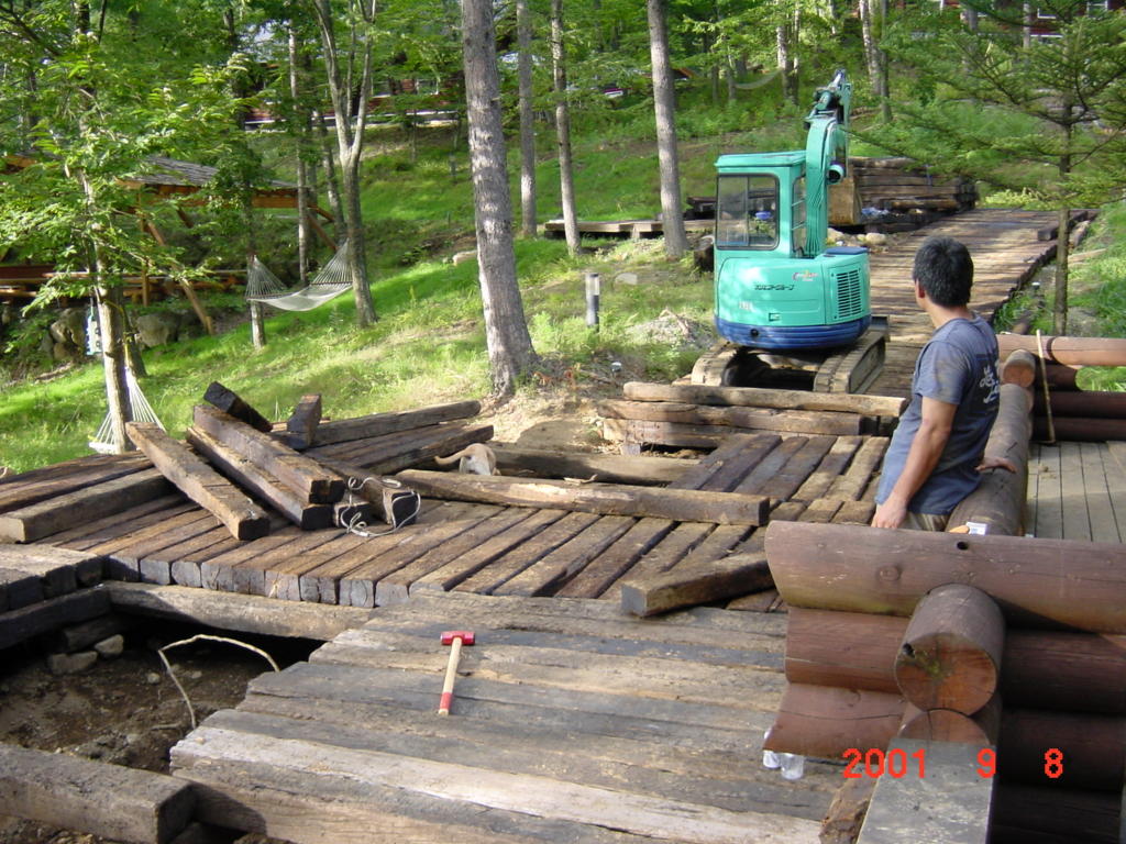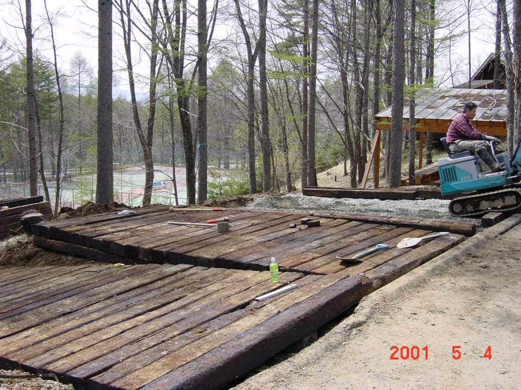 その年の9月の初めには、残った枕木で「テラス」を増設。あれから今年で早19年目。オフィス建設の際に大型ユンボの重量で数本が破損したが、建設業者さんが無料で破損分を交換してくれたため「追加コストまったくゼロ」で、D4の駐車場、焚き火やBBQのスペースとして「大活躍」してくれている。