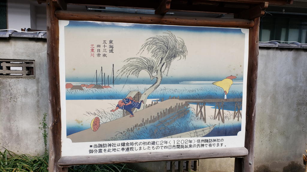 石柱の対面には「東海道五十三次 四日市宿」の看板のようなものが立っており、その下には「当諏訪神社は鎌倉時代の初め建仁2年(1202年)信州諏訪神社の御分霊を此地に奉還致しましたもので四日市開拓以来の氏神で有ります。」と記されていた。