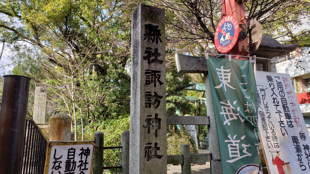 鳥居の方に向かって歩くと、神社の名称を記した石柱を発見。「縣社 諏訪神社」とある。えっ、諏訪大社と何か関係あるのかな??