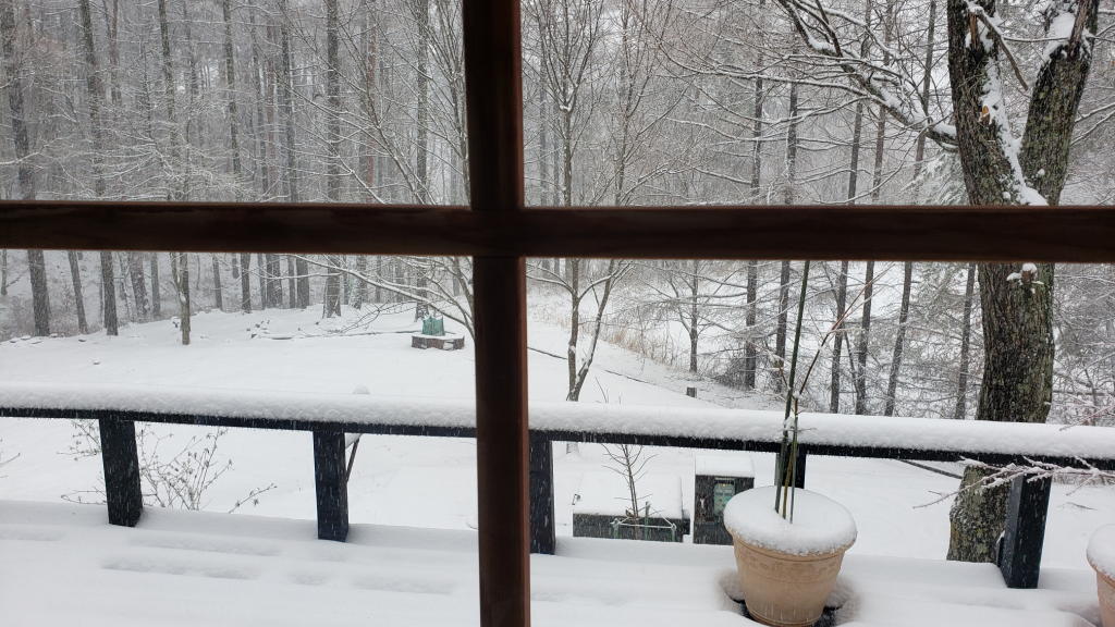 今回の八ヶ岳滞在の最終日となった昨日は「雪の1日」であった。目覚めてすぐに、オフィスデスク上のブラインドを開けると、庭は一面の雪景色。天気予報である程度の積雪は覚悟していたのだが、まさか、あんなに積もるとは思わなかった。
