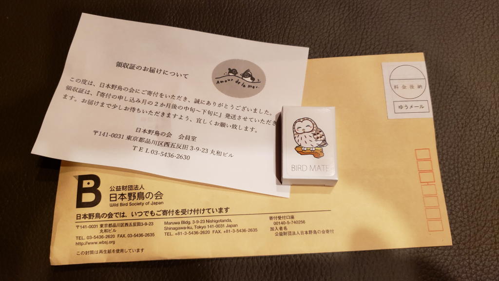そう言えば、日本野鳥の会から何か封筒が届いていたよな。ちょっと厚みがあったけど中身は何だろう? オフィスのデスクの上に置いたままになっていた封筒を開くと「ニッコリ微笑むフクロウ君」のイラストが描かれた白い小箱が現れた。