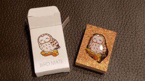 数日前に、2020年のバードメイト寄付(こちらは1口1,000円)を申し込んだ事を思い出した。もう届いたんだ。早いな。箱を開けると、中からイラスト通りの愛らしいピンバッジがご登場。ふくよかで縁起の良さそうな「知恵の神様」だ。
