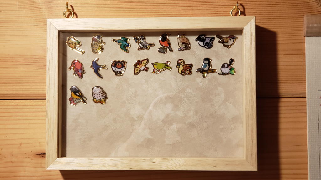 1口5,000円のGINZA TANAKA特製シルバーピンバッジはビジネススーツのお供であるが、バードメイト寄付のカラフルなピンバッジは、オフィスの壁にボックスフレームに入れて飾る事にしている(https://www.triglav.life/?p=26022)。