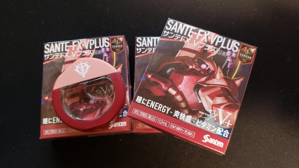手に取ると「機動戦士ガンダム」のシャア専用ザクが描かれていた。赤いケースの目薬なんてお洒落だなと思い、並んでいた3箱すべてを購入する事にした。
