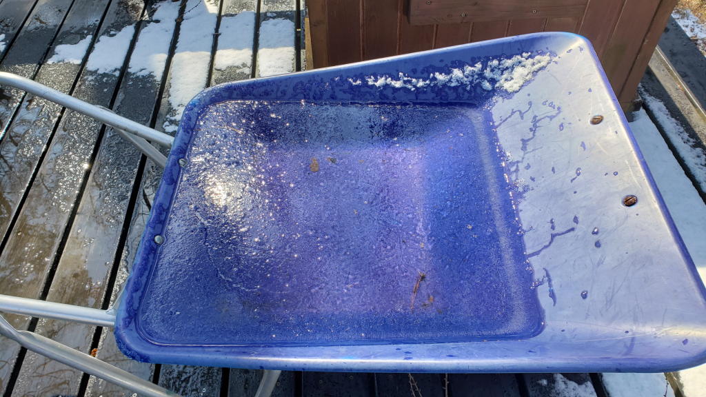 メインウッドデッキに置いたままだった一輪車には雨水が溜まっており、表面は見事に凍っていた。