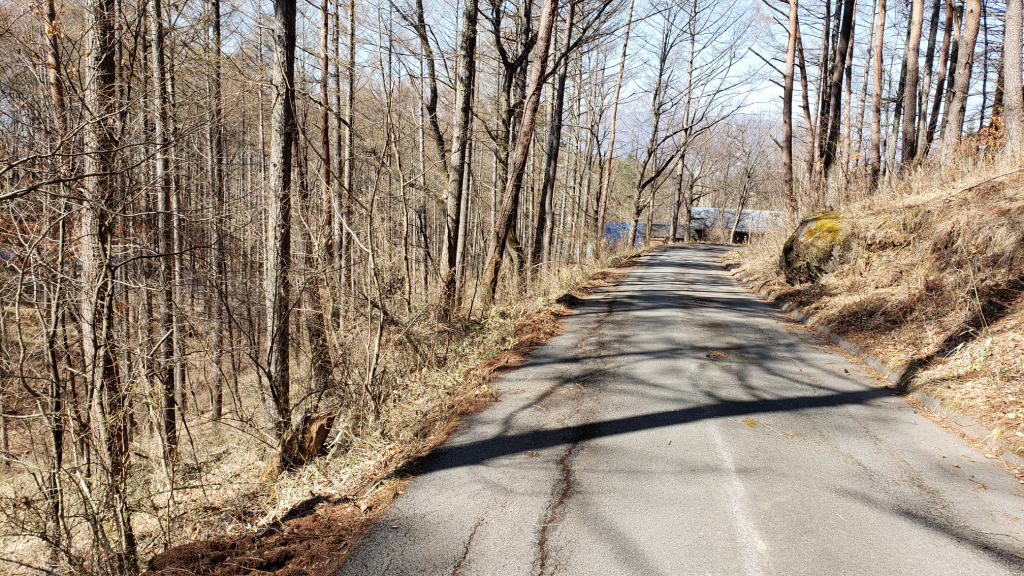 歩くのはかつての春~秋のお散歩道。我が家の敷地に隣接する財産区林の中を流れるフウキ沢(と言っても涸れ沢だが)に沿って林の中の登り道を進み、その後は、主に企業の保養所向けに分譲された別荘地区内の道をグルッと回って我が家に戻る約40分のコースである。