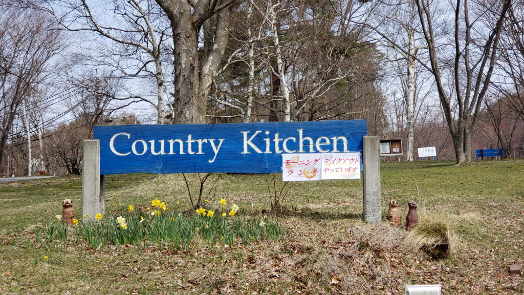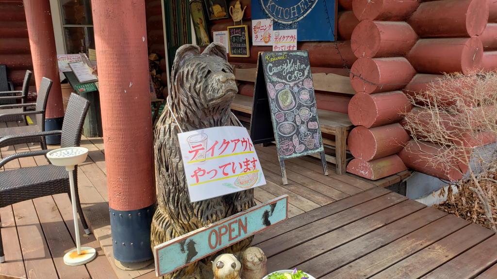 店名の看板やチェンソーアートと思われる熊さんには見慣れぬ「テイクアウトやっています」の表示があった。そうなんだ… 鹿の湯さんのランチドライブスルー美味だったんで、山籠もり中に、カントリーキッチンさんのテイクアウトも利用してみよう!